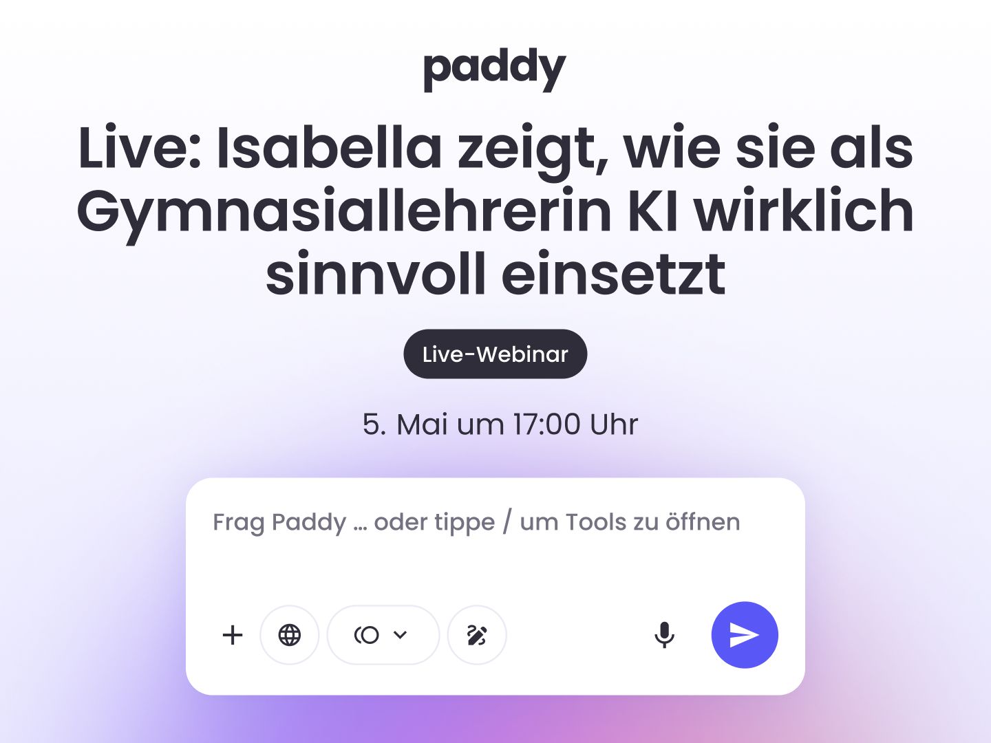 paddy ist die Plattform mit allen KI-Tools, die Lehrkräfte wirklich brauchen – effizient, einfach und sofort einsatzbereit. Entdecke jetzt, wie einfach KI für Lehrer sein kann.