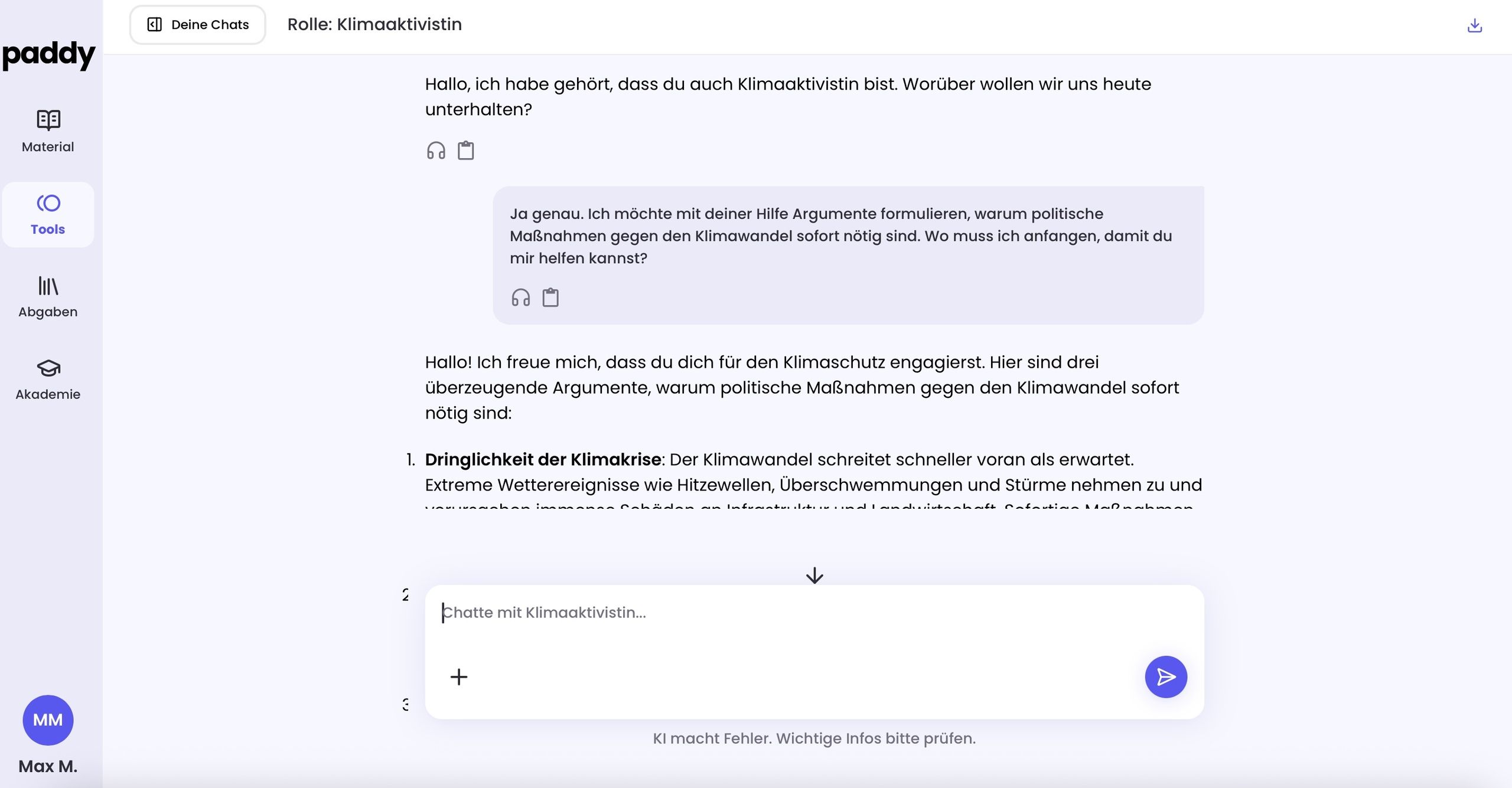„Ich spiele die Rolle eines Klimaaktivisten. Hilf mir, drei überzeugende Argumente zu formulieren, warum politische Maßnahmen gegen den Klimawandel sofort nötig sind. Gib mir auch zwei mögliche Gegenargumente, damit ich mich vorbereiten kann.“