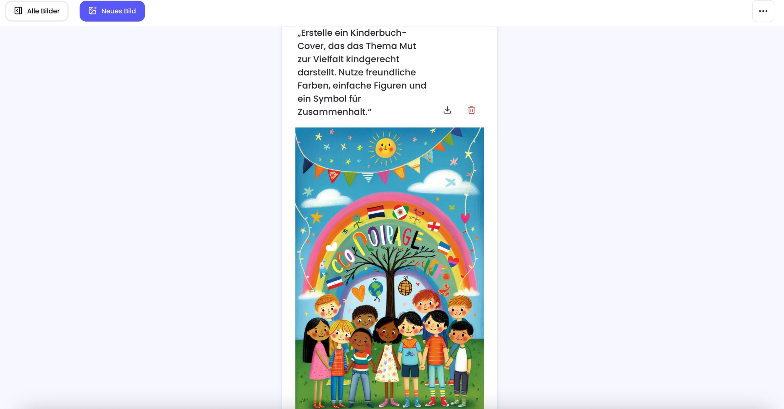 „Erstelle ein Kinderbuch-Cover, das das Thema Mut zur Vielfalt kindgerecht darstellt. Nutze freundliche Farben, einfache Figuren und ein Symbol für Zusammenhalt.“