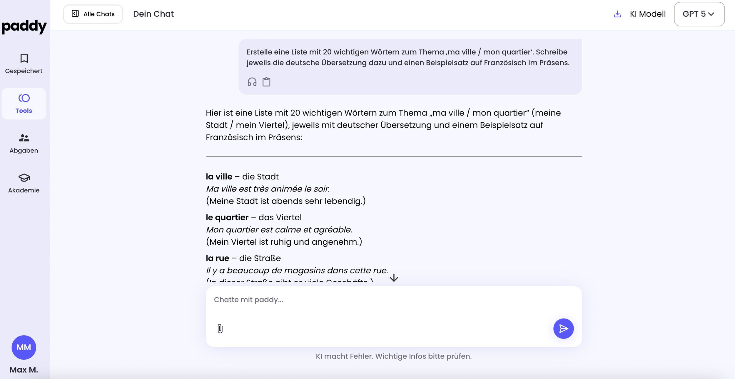 Auftrag: „Stelle mir Wörter und kurze Beispielsätze zum Thema ‚ma ville / mon quartier‘ zusammen.“