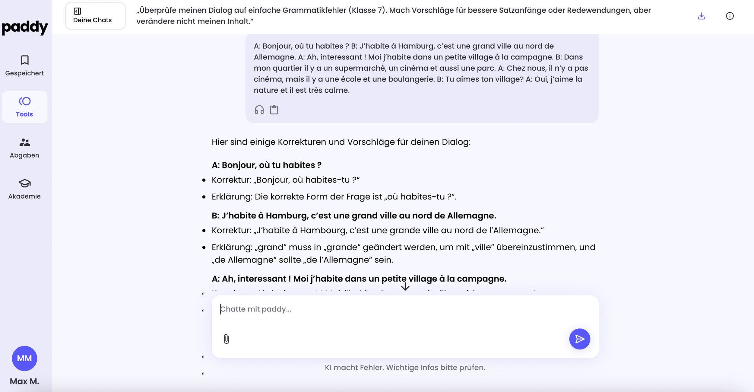 „Überprüfe meinen Dialog auf einfache Grammatikfehler (Klasse 7). Mach Vorschläge für bessere Satzanfänge oder Redewendungen, aber verändere nicht meinen Inhalt.“
